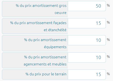 Prenons l’exemple d’un immeuble à 300.000€, pour construire un tableau d’amortissement il faut d’abord connaitre les éléments qui composent la valeur de l’immeuble, et la durée d’amortissement de chacun de ses éléments. Ces paramètres (% et durées) sont complètement personnalisables dans le simulateur.